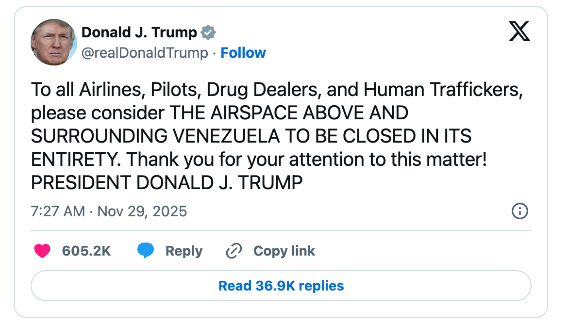At the end of November, Trump publicly stated that the airspace “above and surrounding Venezuela” should be considered “closed in its entirety” to airlines, pilots, and traffickers.