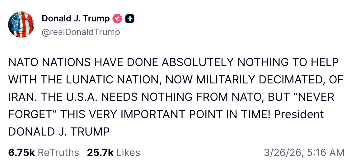 Since the launch of the Iran war, America’s so-called allies have actively obstructed U.S. operations at every turn. They have refused to allow U.S. forces to use U.S. bases in their countries. They have refused overflight rights for U.S. aircraft. When the President asked not for combat troops or fighter jets but just a handful of minesweepers and frigates to protect tankers carrying European oil, Berlin actively mocked him; virtually all refused.