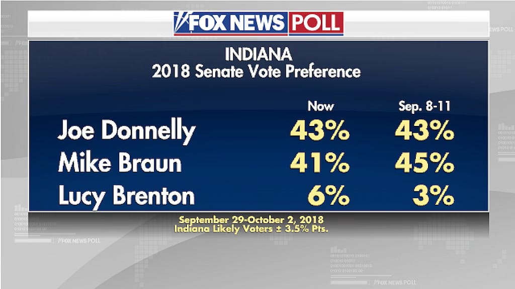 In Indiana, incumbent Dem Donnelly remains within the margin of error with Republican Mike Braun (with idiot Libertarian Lucy Brenton, at 6%, potentially throwing the race to the Dems). The Fox poll (and story) don't account, however, for the fact that Donnelly has announced he's voting no on Kavanaugh, and that's not playing well in Indiana at all. A big Braun surge is highly possible.