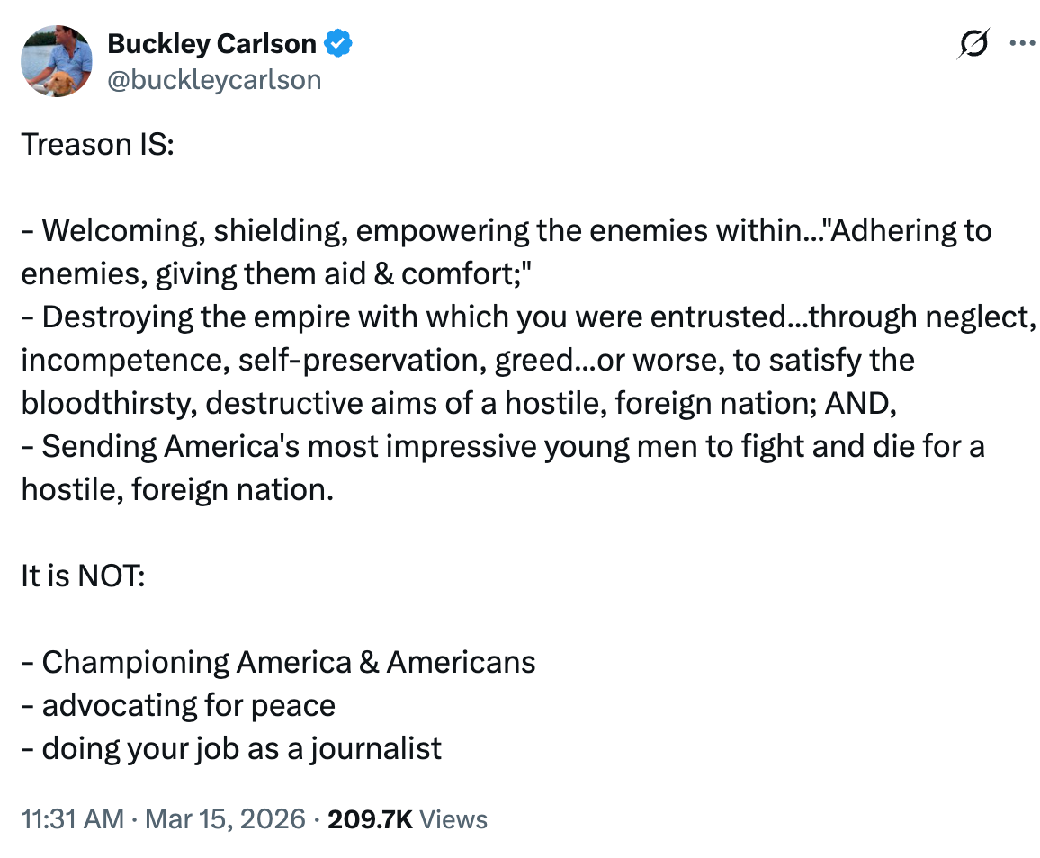First, Buckley Carlson (Tucker's brother; and yes, for those of you from Rio Linda, also the name of his son, but no, his son didn’t post this) took to X to give a lengthy definition of treason and explain why whatever his brother did wasn't that.