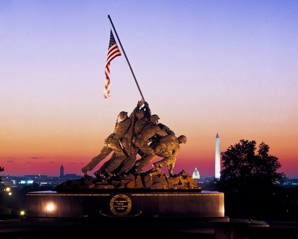 In Arlington, Virginia there is a famous monument, depicting the American victory in the Battle of Iwo Jima. One of the most famous statues in our capital, it shows six U.S. Marines and Navy Corpsmen raising the flag at the summit of Mount Suribachi, one of the most iconic moments of the entire Pacific War.