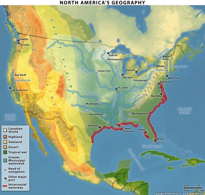 The American heartland — bounded by the Appalachians to the east, the Rockies to the west, and the Gulf to the south — is one of the most fertile and navigable regions on Earth. Its river systems, particularly the Mississippi and its vast tributaries — the Ohio, the Missouri, the Arkansas — form an internal highway system unrivaled anywhere in the world.
