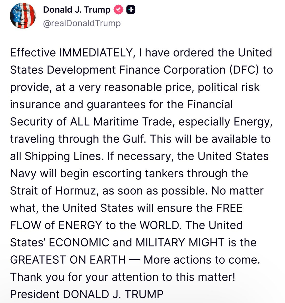 On March 3, he announced that the U.S. Development Finance Corporation would mobilize political-risk insurance and guaranty products to support private-sector operations in the Gulf, including shipping. Three days later, Reuters reported that the United States would provide reinsurance for maritime losses up to about $20 billion. Later, Reuters reported that Chubb would serve as the lead insurer for the DFC-backed plan.
