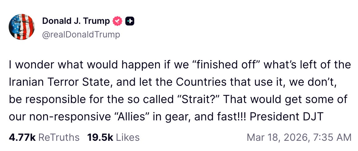 It’s even more galling to hear the German Chancellor this week saying “this is not our war”, even though Europe gets vastly more of its energy from the Persian Gulf than we do, and all Donald Trump asked of it was some help with minesweeping and tanker escort. Yesterday, all the intransigents backed off that position, with Britain, France, Germany, Italy, the Netherlands, and Japan promising in a joint statement to help ensure safe passage through the Strait. Perhaps they read Trump’s tweet. But the delay, and the dismissal, are maddening.